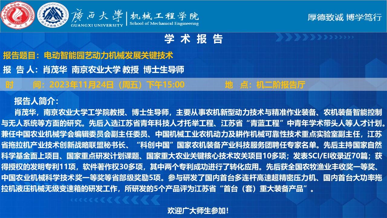 【机械工程学院学术报告】 电动智能园艺动力机械发展关键技术