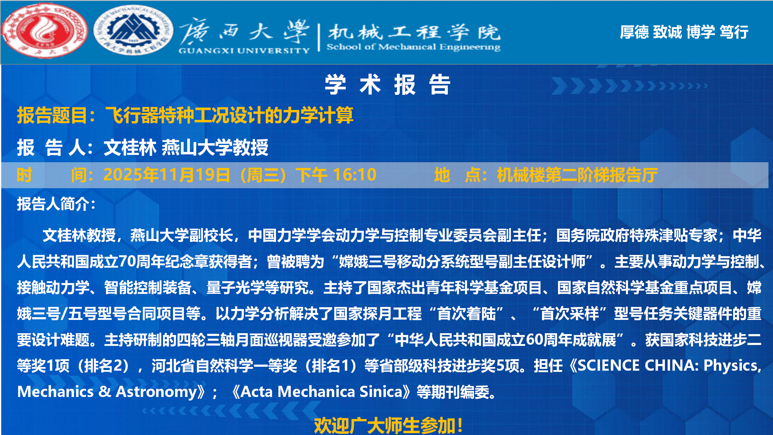 【机械工程学院学术报告】飞行器特种工况设计的力学计算