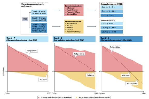 在第二个政策设计中,净零政策中纳入了固定的源头减碳目标(与CDR分开),此时并行部署的CDR仅作为补充而非取代脱碳。根据这一设计,一个国家可以自由选择高或低CDR路径,只要部署的CDR足以实现净零目标即可。尽管国家A和国家C均在2060年达到相同的剩余排放水平,但国家C通过积极的CDR部署,能够更早地实现净零排放并过渡到净负排放。因此,CDR既可以推迟减排速度,延长超调时间,也可以与快速脱碳相结合,作为加速实现净零和净负排放、缩短温度超调期的关键工具。