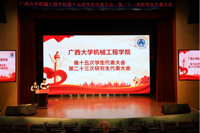 11月2号下午,广西大学机械工程学院第十五次学生代表大会、第二十三次研究生代表大会在广西大学大学生活动中心小剧场胜利召开。院党委书记卢婵江、党委副书记黄路明、团委书记李华、团委副书记林超、学工组辅导员农婷婷、曾祥喜、校学生会、研究生会代表、各兄弟学院学生代表及我院学生代表出席大会。