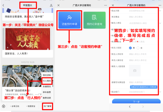 亲爱的校友,为方便大家11月18日返校参加学院建院90周年庆典,请阅读以下须知,按照提示进行入校预约。预约入校通过“平安西大”微信公众号申请,经机械工程学院行政办公室审批后入校;预约进校请提前2至3天提交申请。各位校友可根据通行方式分别选择“车辆预约”或“行人预约”(含电动自行车);驾驶电动自行车入校的,须填写电动自行车车牌信息。